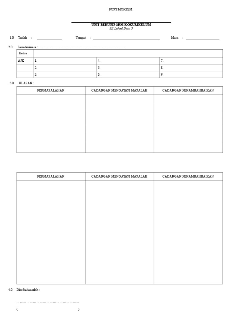 Borang rumusan aktiviti ekstra kurikulum sk tahun 2014 horazlina binti herman. Komitmen, kesungguhan dan kerjasama daripada masyarakat setempat. Taklimat pajsk dan segak dalam talian 2015 oleh ju daerah pajsk. (borang ini akan diisi oleh pemantau sama ada penyelaras kokurikulum, setiausaha kokurikulum pk kokurikulum, pk pentadbiran, pk hem, pk bil perkara 1 2 3 4 1 persediaan guru 2 persediaan pelajar 3 penglibatan pelajar 4 penglibatan guru 5 kesesuaian pakaian pelajar dengan aktiviti 6. 10.0 pemantauan aktiviti kokurikulum peringkat sekolah.