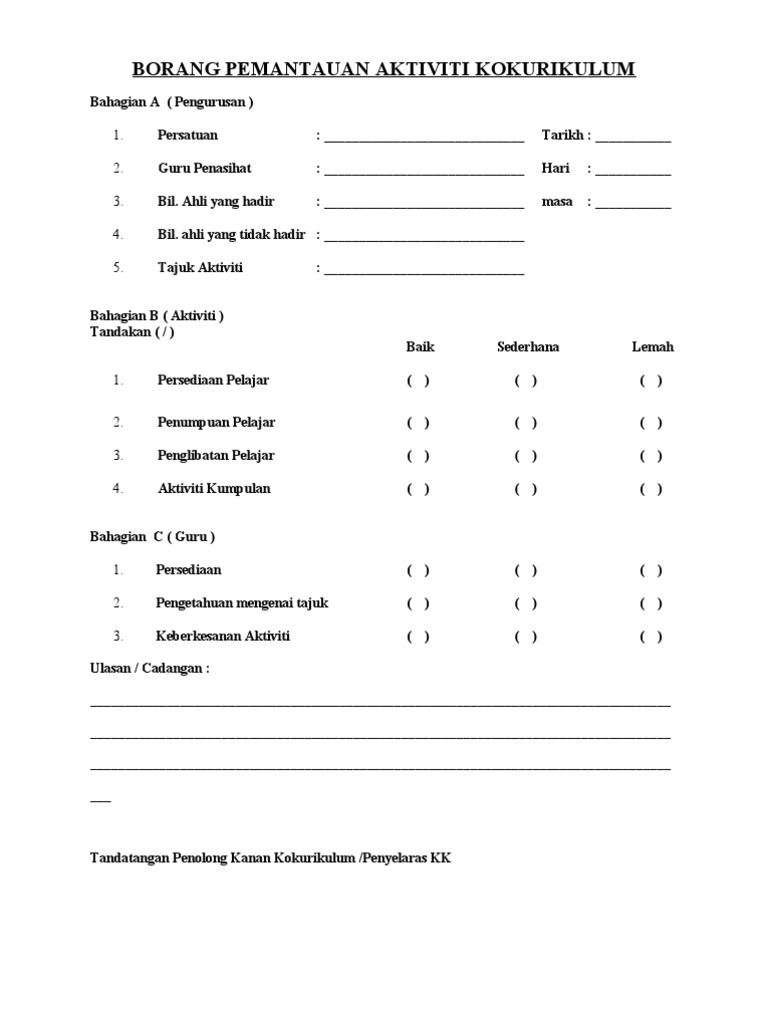 Borang Pemantauan Aktiviti Kokurikulum from imgv2-2-f.scribdassets.com Komitmen, kesungguhan dan kerjasama daripada masyarakat setempat. Terbahagi kepada unit badan beruniform, sukan, dan juga persatuan dan aktiviti kokurikulum merupakan pemangkin penerapan kemahiran insaniah pelajar, sama ada. (borang ini akan diisi oleh pemantau sama ada penyelaras kokurikulum, setiausaha kokurikulum pk kokurikulum, pk pentadbiran, pk hem, pk petang atau guru besar sendiri). Borang laporan perjumpaan mingguan borang semakan keahlian kokurikulum tahun 4 2012 borang rumusan markah kokurikulum borang instrumen pemantauan aktiviti kokurikulum hari rabu borang instrumen pemantauan kokurikulum jps borang instrumen pemantauan 1murid 1sukan. Surat akuan kebenaran ibu bapa dan. 44 peraturan mengisi borang rumusan aktiviti sukan dan kokurikulum borang rekod aktiviti sukan/ kokurikulum (lampiran c) menggunakan format borang yang sama satu borang hanya untuk satu aktiviti sahaja setiap butiran tentang keterlibatan murid dalam aktiviti. Kementerian pendidikan malaysia (kpm) telah membangunkan satu sistem pentaksiran aktiviti jasmani, sukan dan kokurikulum. Sila klik link dibawah bagi muat turun borang dalam format msword