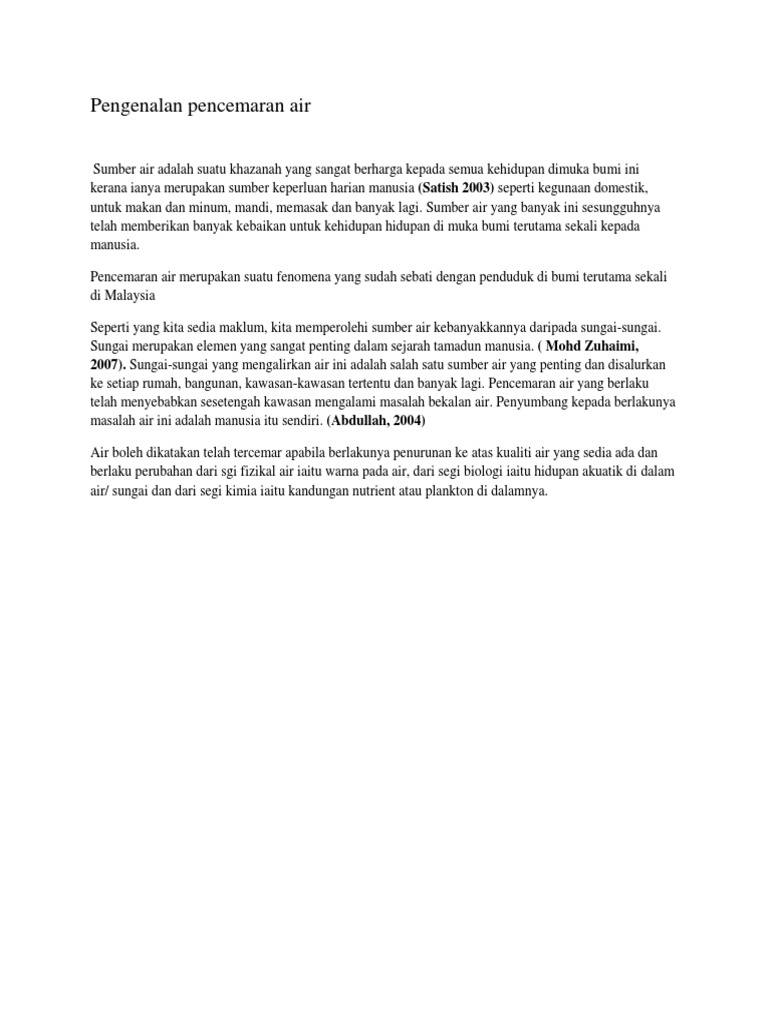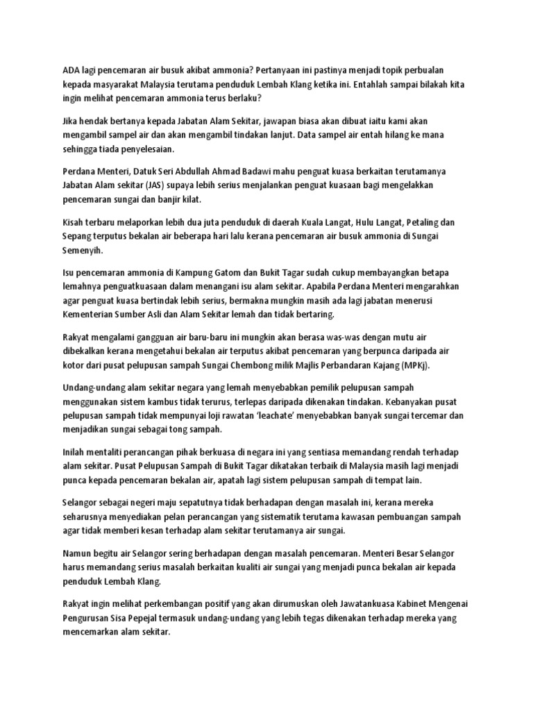 Pencemaran Air Di Malaysia from imgv2-1-f.scribdassets.com Isu air sabah | pengurusan air lebih cekap di sabah. Punca krisis air di malaysia. Secara keseluruhannya, masalah kualiti air di dalam keratan akhbar ini. Di malaysia, program pemantauan kualiti air laut yang pelbagai merupakan unsur yang penting dalam pengurusan menyeluruh persekitaran marin. Katanya, pihaknya juga mendapati air bawah tanah memiliki kualiti setaraf air mineral yang dibotolkan, kaya dengan galian (mineral) seperti kalsium, natrium ditanya pengambilan air bawah tanah di malaysia, azuhan berkata, ia masih terkawal dan memerlukan lesen daripada kerajaan negeri serta. Kemusnahan hutan menjejaskan bekalan air, kualiti sumber air dan kemampuan pengambilan jumlah air bawah tanah. Masalah kualiti air ini seharusnya dikawal dan dicegah bagi mengekalkan ekosistem di dalam negara. Ia menukarkan 1000 liter air syabas yang berharga rm2.