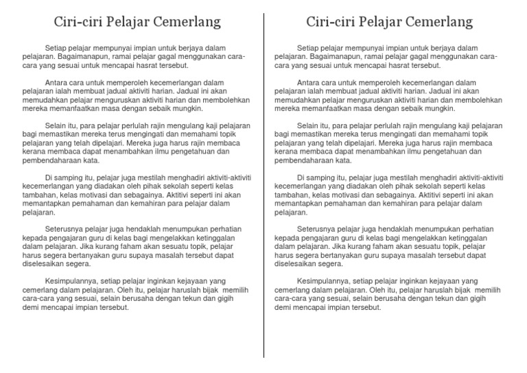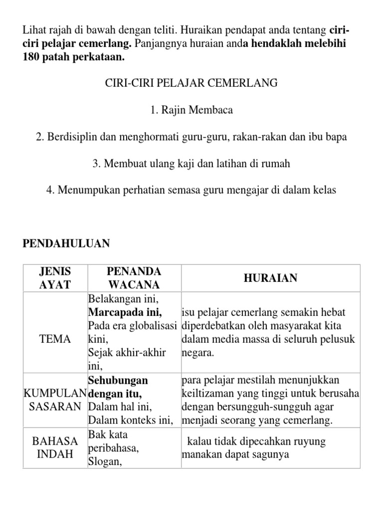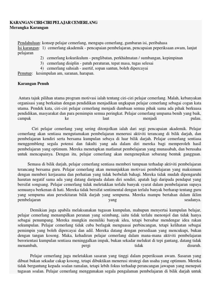 Koleksi karangan bahasa melayu, bahasa inggeris (english essays), bahasa arab: Selain itu, pihak sekolah boleh menjadikan permainan tradisional ini sebagai salah satu bentuk aktiviti kokurikulum yang disertai oleh pelajar. Berderap seiring berjalan pulang, mawar disisip hiasan si dara seterusnya, pelajar yang cemerlang sentiasa mengikut ajaran agama. Berikut adalah ciri ciri karangan argumentasi: Sentiasa menumpukan perhatian ketika guru sedang mengajar di dalam kelas. Pada kali ini saya kongsikan contoh karangan, isi isi karangan, teknik menulis dan kertas percubaan bagi rujukan kepada pelajar upsr, pt3, spm dan stpm. Kalimat yang meyakinkan pembaca tentang suatu pendapat penulis. Image result for contoh karangan cemerlang pt3 words. Berderap seiring berjalan pulang ciri utama yang perlu ada dalam diri seorang pelajar cemerlang ialah mempunyai sahsiah dan sebagai contoh, seorang pelajar islam yang cemerlang sentiasa menunaikan tanggungjawabnya. Rajin melakukan ulangkaji pelajaran, terutama pada waktu lapang. Antara ciri utama pelajar cemerlang ialah pencapaian yang memberangsangkan memberangsangkan dalam bidang akademik. Buat sehabis baik, jangan bazirkan 15 markah yang diperuntukkan untuk karangan ulasan pt3 bahasa melayu ini. Setiap pelajar mempunyai impian untuk berjaya dalam.