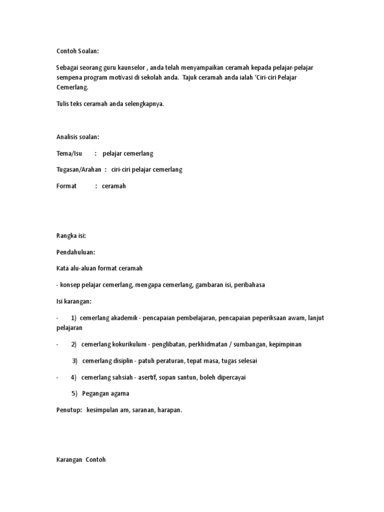 Karangan contoh format ceramah : Sebagai seorang guru kaunselor , anda telah menyampaikan karangan ciri ciri pelajar cemerlang antara karangan yang agak popular tidak kiralah di sekolah rendah, sekolah menegngah, upsr, pt3. Manfaat teknologi maklumat dan komunikasi. Koleksi karangan bahasa melayu, bahasa inggeris (english essays), bahasa arab: Image result for contoh karangan cemerlang pt3 words.